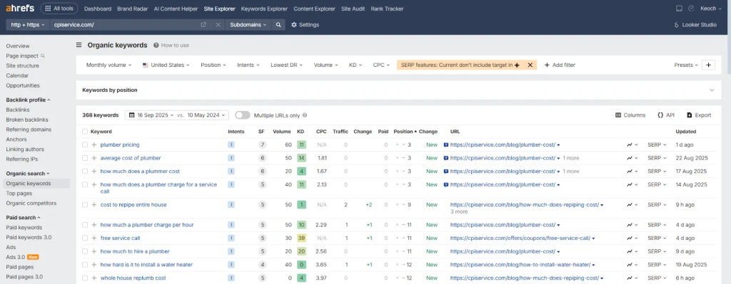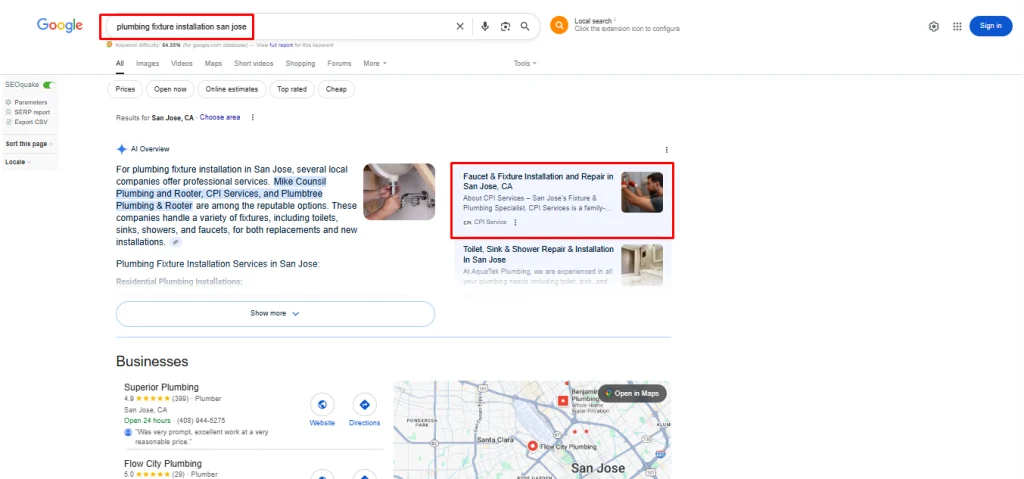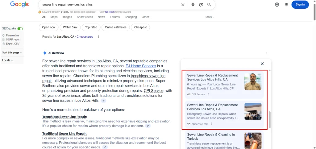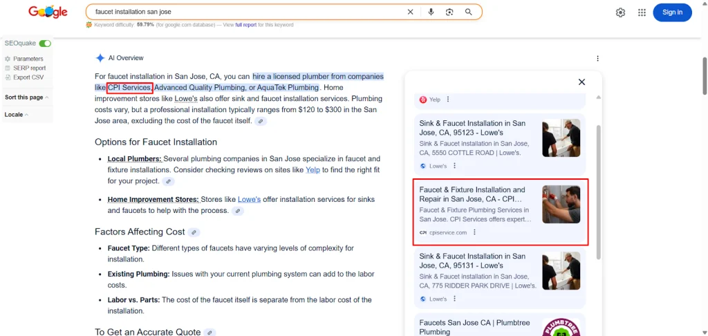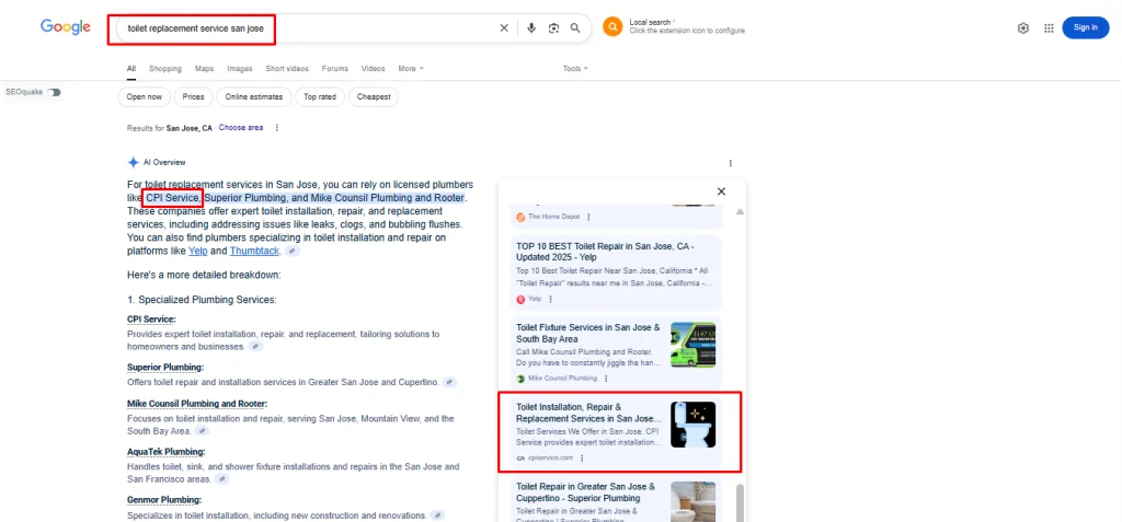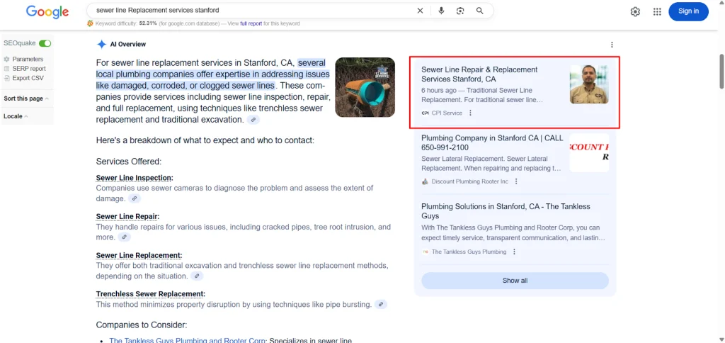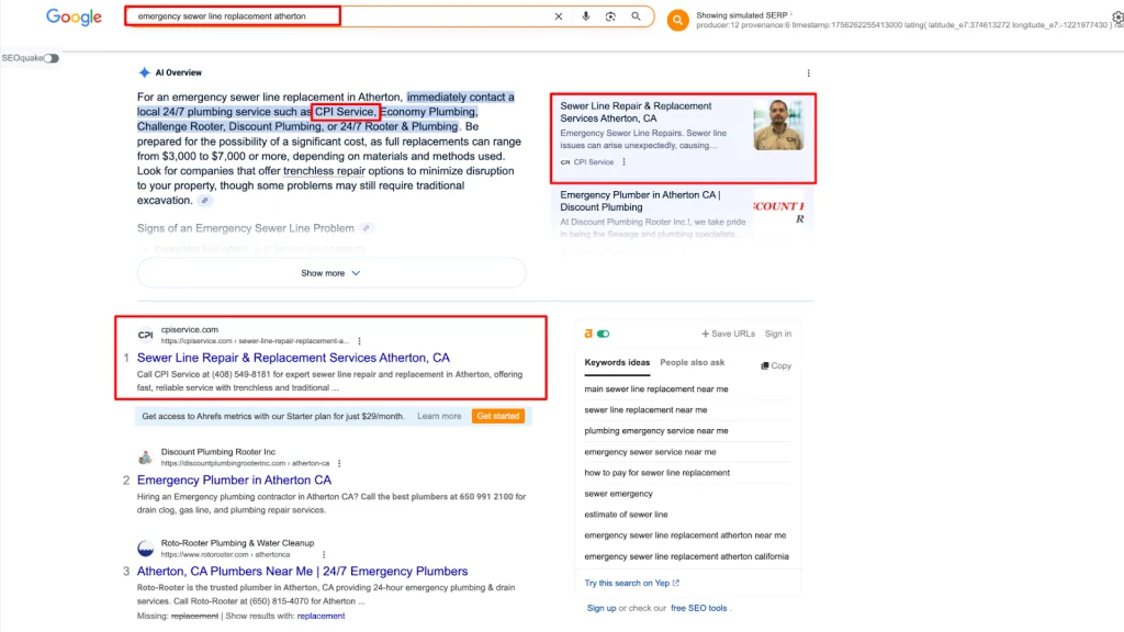 The strategy delivered measurable results within hours. CPI Service began appearing inside Google’s AI Overviews for multiple high-intent plumbing keywords. This placement gave them premium visibility at the very top of search, where Google highlights trusted providers. For a local service business, this meant being seen immediately when homeowners searched for urgent solutions, a position that builds trust and captures traffic.