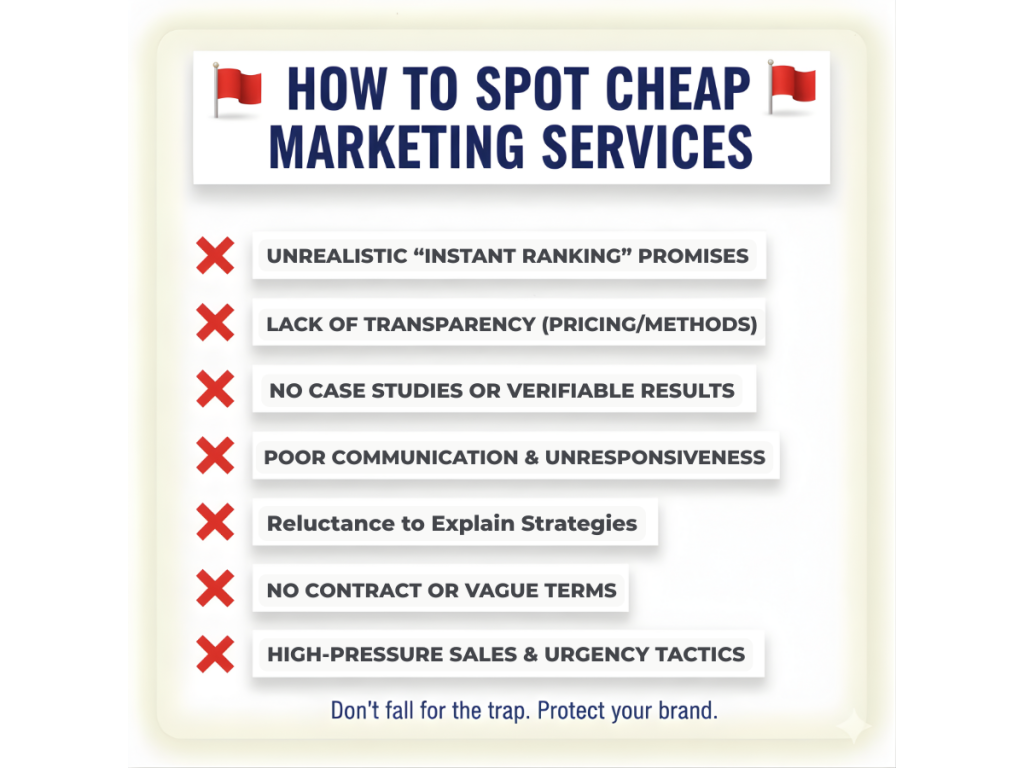 You should avoid cheap marketing services because they often deliver low-quality, generic work that harms your brand, fail to understand your specific business needs, and damage your online reputation, resulting in wasted budgets and repeated corrections. Cheap digital marketing services, including cheap SEO services, prioritize short-term visibility over sustainable growth and rely on limited expertise or unethical shortcuts that destabilize performance, credibility, and search engine rankings. Their approach trades immediate savings for long-term losses, weakening both digital presence and consumer trust.